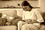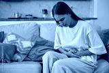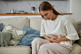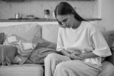 Caucasian young adult woman sitting on sofa holding stomach with both hands appearing to experience abdominal pain or discomfort in home living room setting