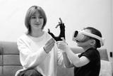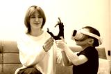 Caucasian female adult with child boy using vr headset and toy robotic arm in modern setting
