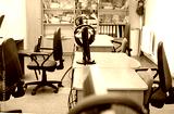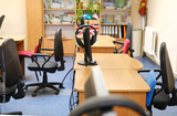 English classroom featuring wooden desks and chairs, with headphones on a stand, surrounded by shelves of books, creating an inviting learning environment with copy space