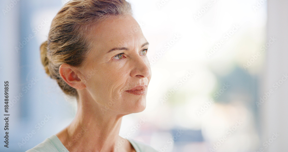 Home, thinking and woman with ideas, wonder an contemplation with reflection, ponder and relax. Mature person, thoughtful and solution with memory, remember and nostalgia with weekend break and rest