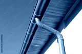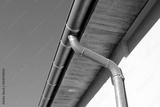 Gouttière zinc gris sur la façade de la maison, descentes rondes et sous-face en lambris bois