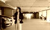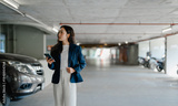Businesswoman searching parking spot holding smartphone