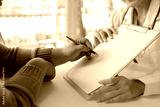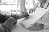 Patient hand holding pen, signing a medical consent form on a clipboard with a doctor in a healthcare consultation