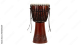 Brown wooden djembe drum isolated PNG, traditional African percussion instrument with rope tuning and carved base on transparent background