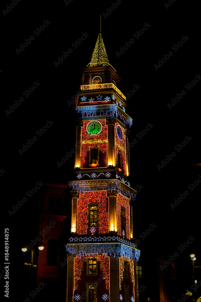 Illuminated Clock Tower with Festive Holiday Lights at Night