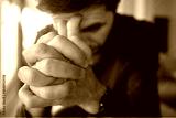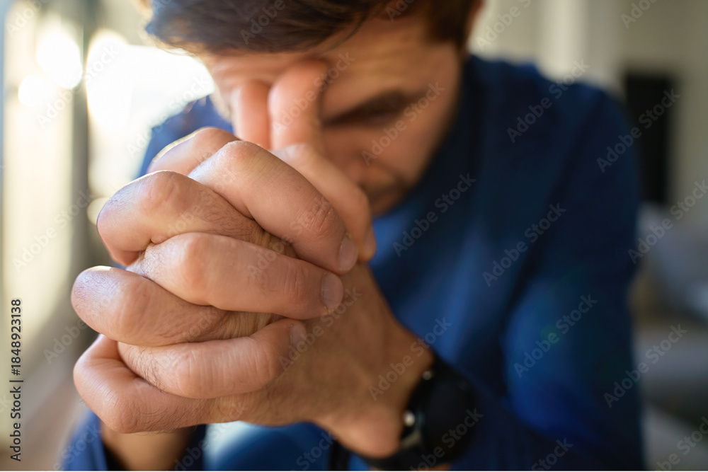 Worried man sitting at home by window with clasped hands. Nervous person with problems sitting on sofa. Concept of anxiety, stress and mental health