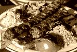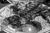Adana kebab plate with two juicy grilled meat skewers, bulgur pilaf, charred pepper and tomato, fresh salad and onion garnish for an authentic turkish meal