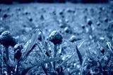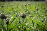 Artichoke buds growing on plants in a large agricultural field, ready for harvest, symbolizing organic farming, healthy eating, and fresh produce