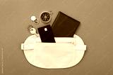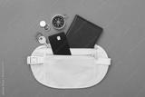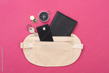 Traveler organizer bag with passport and accessories on color background, top view