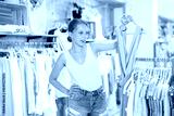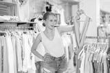 Young female shopper choosing summer dress in clothing store