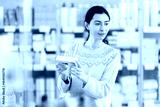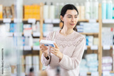 Young woman is holding a package of cooling ointment for joints and muscles. European woman buys gel for muscle pain at the pharmacy