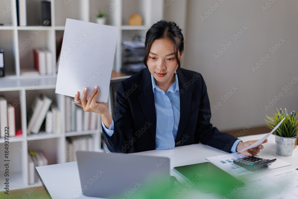 Smiling young asian woman accountant and auditor working in the office, sitting at the table and checking bills and data in documents.
