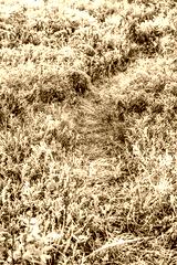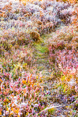 Frost iced trail path of blueberry bushes illuminated by morning sunlight at Dolly Sods, West Virginia