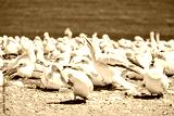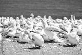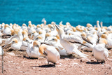 Closeup of white Gannet bird colony nesting on cliff on Bonaventure Island in Perce, Quebec, Canada by Gaspesie, Gaspe region with one morus shaking head sideways