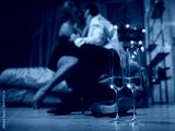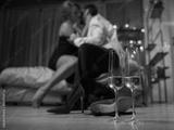 Focus on two glasses of champagne on floor. Ardent loving couple is sitting on bed and hugging with passion on background. Romantic date concept