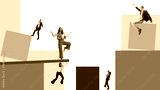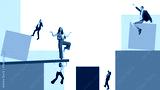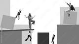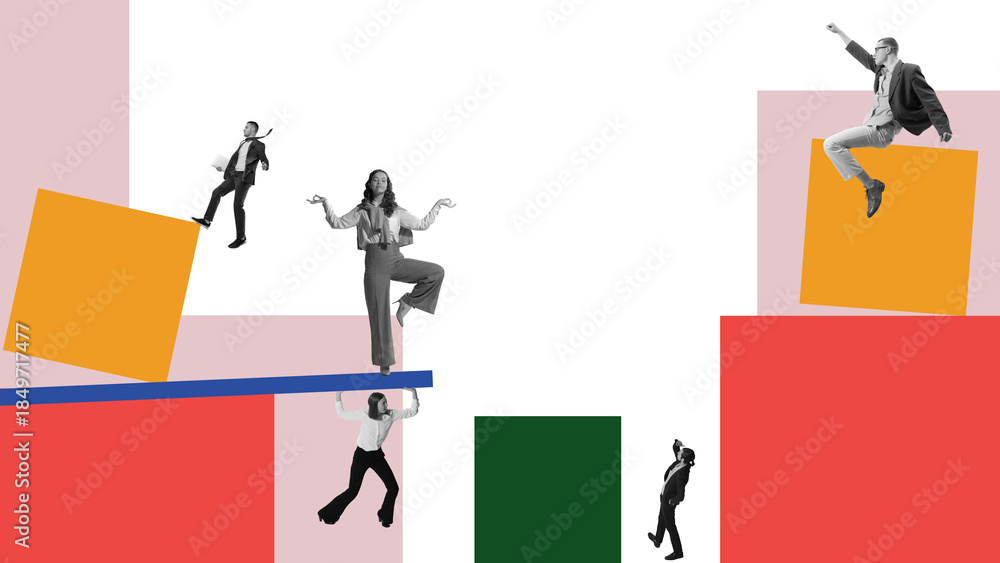 Dynamic composition with business people balancing on abstract geometric shapes on transparent background. Concept of corporate decision making, leadership balance, career growth and business strategy