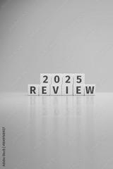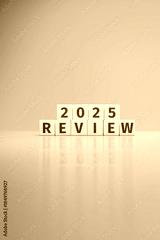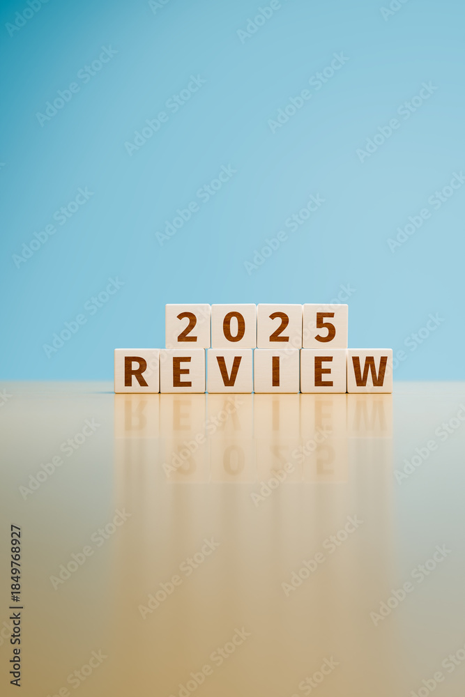 Wooden toy cubes forming the text "2025 REVIEW". Concept for reviewing what happened in the year 2025. Magazine cover format with copy space