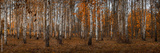 Autumn birch rural park. Branchy trees with orange foliage. Beautiful golden autumn. Vibrant colors of October. Panoramic stock photo in 15:5 format