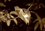 Female dwarf epauletted fruit bat (Micropteropus pussilus) flying with a baby on her belly, Volta Province, Ghana.