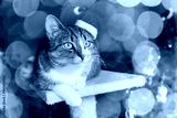 Cat wearing a santa hat sits on a scratching post surrounded by warm lights during the Christmas season in a cozy indoor setting