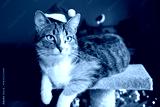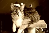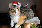 Cat wearing a santa hat sitting on a tree perch near a decorated christmas tree in a cozy room