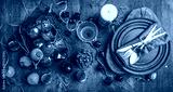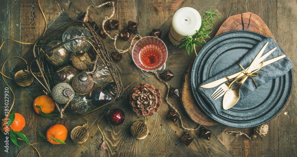 Christmas or New Years eve holiday table setting. Flat-lay of plates, silverware, champaigne in glass, candle and toy festive decorations over vintahge table background, top view