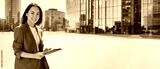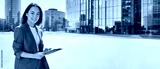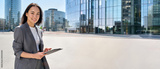 Young happy Asian business woman wearing suit holding digital tablet standing in big city on busy street, using smart business software tech for online work on pad computer. Banner, copy space