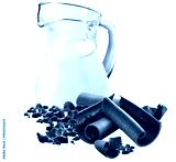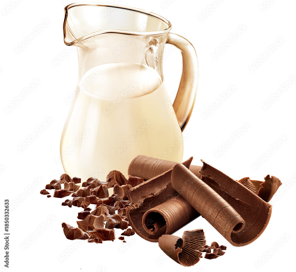 Jarra com leite acompanhado de pedaços de chocolate ao leite isolado em fundo transparente