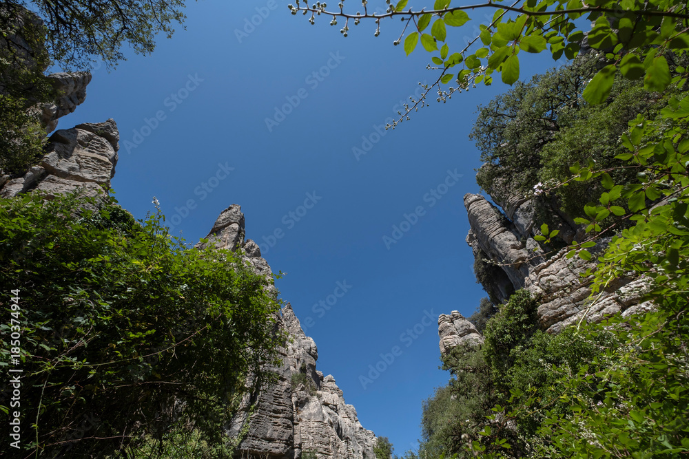 Karstic alley among pinacles of jurassic limestone covered with wild mediterranean vegetation. Torcal de Antequera Natural Park, Malaga, Spain
