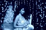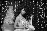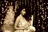Glamour fashion brunette girl Christmas portrait. Elegant sexy woman in sensual dress with evening makeup, long wavy healthy hair style, golden jewelry, matte manicured nails posing over bokeh lights.