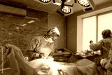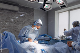 Female surgeon in blue scrubs performing surgery in a modern operating room, illuminated by bright surgical lights, showcasing precision and professionalism in a critical medical procedure