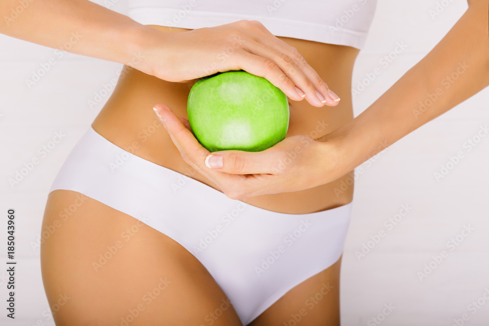 woman dressed in white underwear, holding a green apple in her hands, close-up. concept of the perfect body, healthy diet.