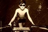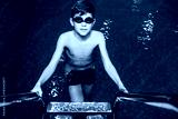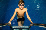 Boy wearing swim goggles, standing on the stairs in the swimming pool and looking at camera. Top view, children, swimmer.