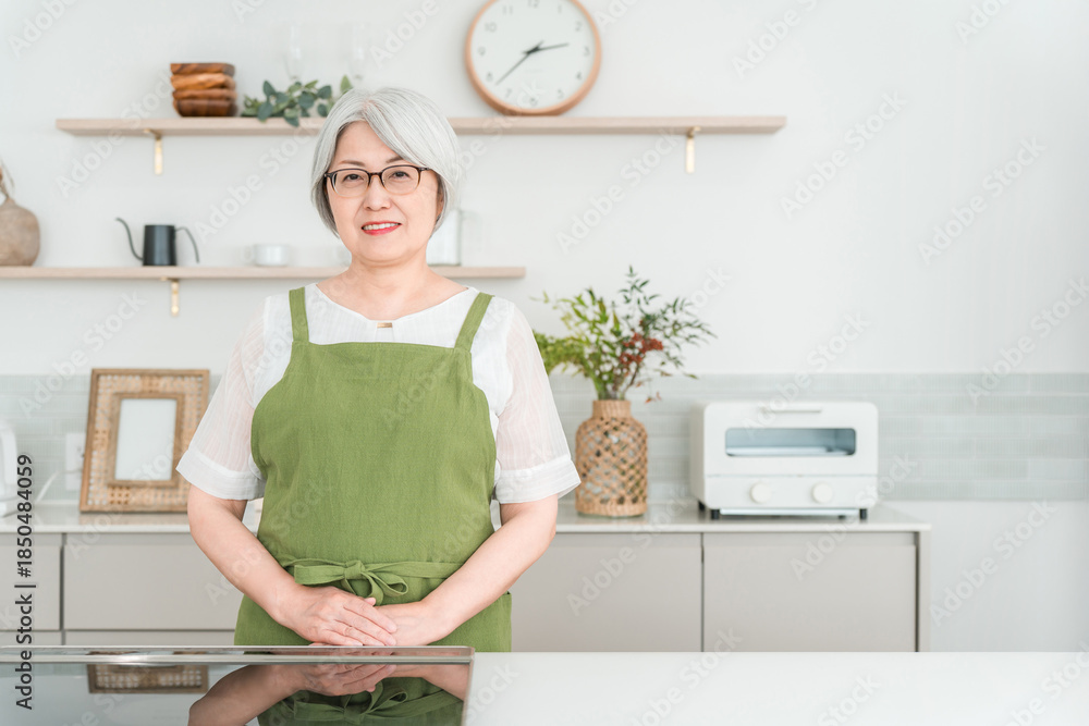 Senior Asian woman in an apron cooking in the kitchen at home