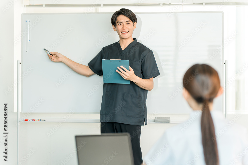 Male staff including doctors, nurses, and pharmacists explaining in front of a whiteboard at a medical conference