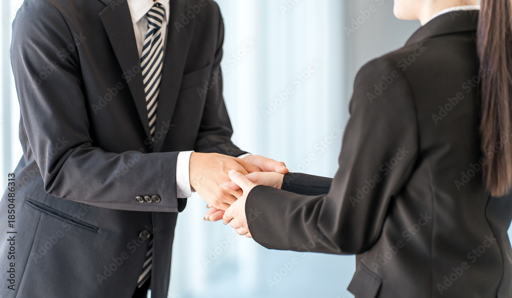 Businessmen and women shaking hands in a corporate office to greet, introduce themselves and conclude a contract