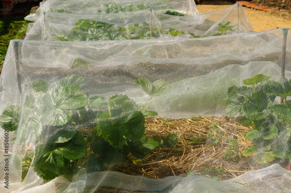Strawberries growing underneath netting to keep birds and insects off them.