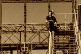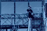 Man sits in control on stair rail within a red metal structure, gazing confidently toward camera while demonstrating balance and spatial awareness. Precision in urban acrobatic movement. Parkour
