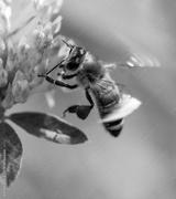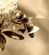 A bee is flying over a pink flower