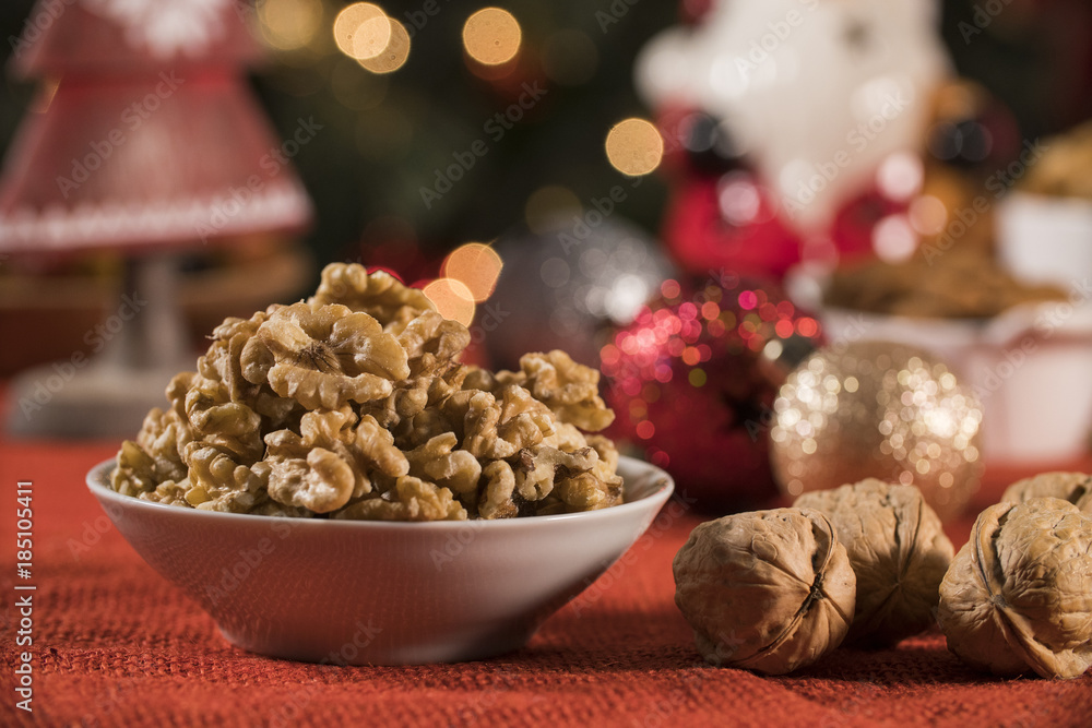 Walnut kernels into a bowl on rustic old wooden table with christmas background