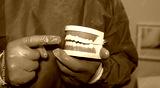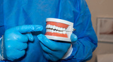A healthcare professional wearing blue gloves demonstrates dental hygiene using a dental model, highlighting the importance of oral care in a clinical environment.