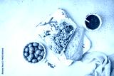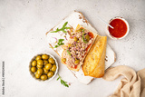 Sandwiches with canned tuna, tomato and olives. Bocadillo with tuna. Food recipe background. Close up, top view