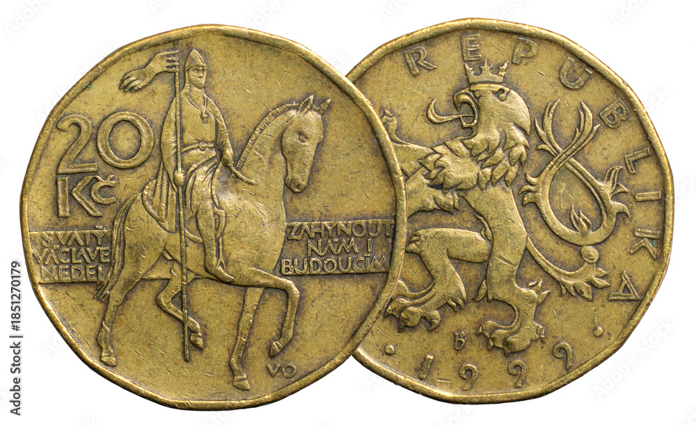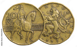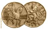 Close-up of the obverse and reverse of a Czech 20 korun coin from 1999, featuring the statue of St. Wenceslas on horseback and the coat of arms of the Czech Republic (lion).