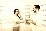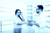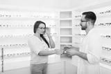 woman chooses eyeglasses to correct vision standing at ophthalmological store near shelf with many glasses. Consultant ophthalmologist helps the visitor to choose a frame for glasses.