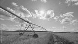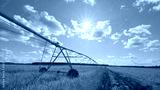 A Sunny Agricultural Field with an Advanced Irrigation System in Full Operation Today