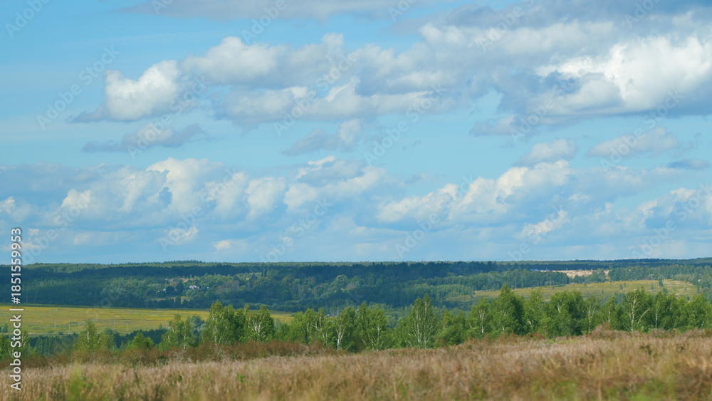 A beautiful landscape with fluffy clouds, lush greenery, and vibrant colors all around