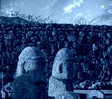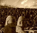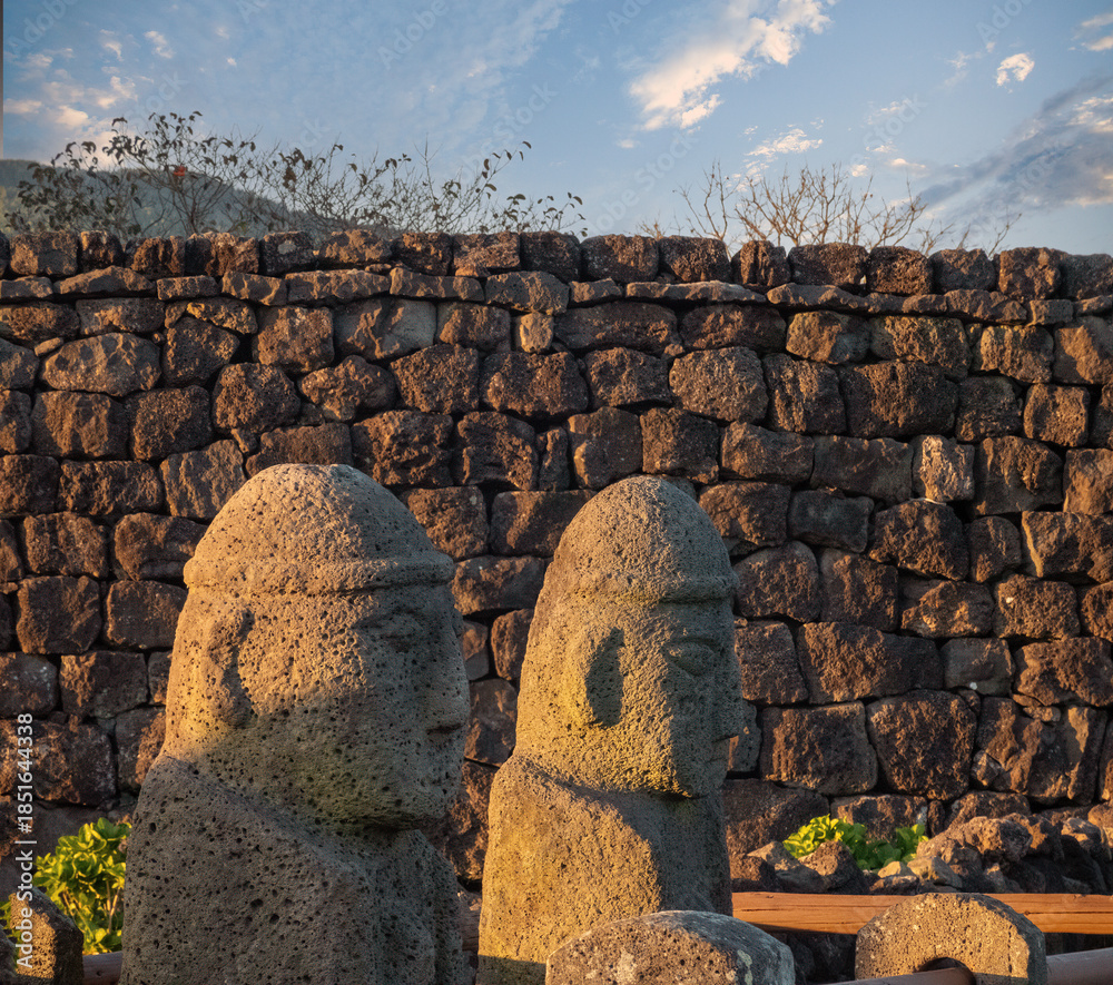 A couple of Traditional stone dol figures in the outer walls of a folk village on the island of Jeju, South Korea
