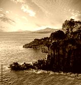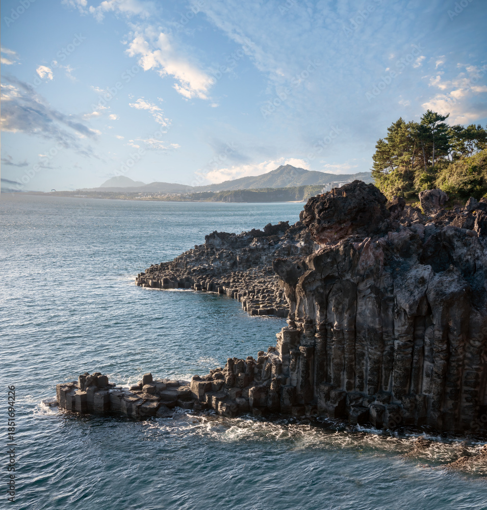 Dramatic scenery at Jugsangjeolli cliffs, Seogwipo city, southern Jeju Island, South Korea. The large hexagonal columnar joints formed from cooling lava flowing into the ocean