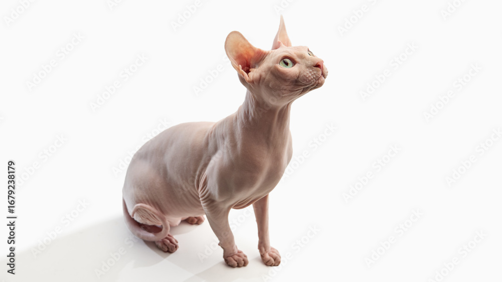 Young delivery woman with thermal backpack isolated on white background pointing to the side to present a product