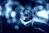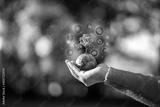 Close up of a hand holding a small globe with a growing tree surrounded by digital ESG icons for sustainability, environmental protection, and green energy concept